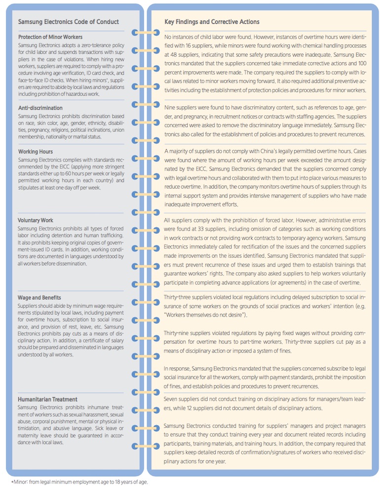 Nel rapporto 2014 di Samsung si afferma che il 90% della produzione avviene in fabbriche controllate con la sua diretta supervisione, mentre il 10% avviene in luoghi nei quali non ha controllo diretto. I sud coreani ammettono la necessità di sforzi nel settore e affermano di essere pronti a intervenire “per prevenire qualsiasi caso di sfruttamento minorile da parte dei nostri fornitori, così come prevedono le nostre politiche di tolleranza zero”.