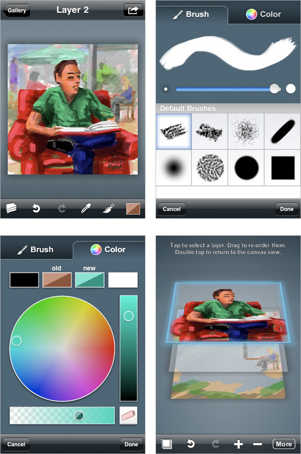 Per creare e disegnare Layers offre 8 pennelli diversi di cui l’utente può regolare in modo preciso la dimensione, una tavolozza colori particolarmente completa con la quale è possibile creare trasparenze, una corposa serie di passo avanti passo indietro che lasciano massima libertà  al disegnatore. Tra i punti forti di Layers ricordiamo infine la possibilità  di inviare il disegno appena creato come file JPG oppure anche in formato Photoshop PSD allegato alla mail. In quest’ultimo caso tutti i livelli utilizzati per la creazione vengono conservati. Abbinato a Layers gli sviluppatori offrono come download gratuito Layers Replay Viewer per Mac OS X: oltre a sincronizzare tutti i disegni memorizzati sul tascabile con il Mac, il software permette di esportare i disegni in file in alta risoluzione fino alla risoluzione di 4096×4096, infine creare filmati QuickTime con il processo di creazione.
