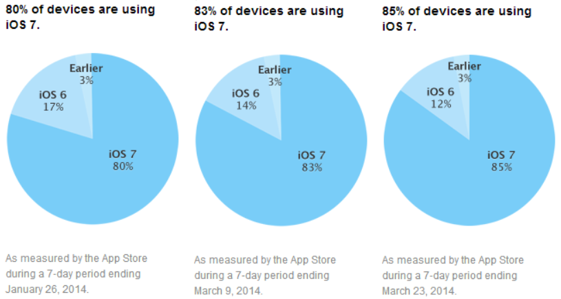 Attualmente, sembra che Apple stia comprendendo iOS 7.1 all’interno della categoria iOS7, ragion per la quale risulta impossibile capire esattamente quali siano le adozioni dell’ultimo aggiornamento rilasciato da poche settimane, ma quasi certamente l’ultimo update rappresenterà una grossa percentuale sul totale, dato che sono molte le migliorie e le correzioni apportate da Apple rispetto ad iOS 7.0. I dati attuali diffusi dalla casa di Cupertino fanno affidamento al traffico dei dispositivi che scaricano applicazioni in App Store a far data dal 1 dicembre 2013, quando già iOS 7 aveva raggiunto il 74% dei dispositivi mobili.