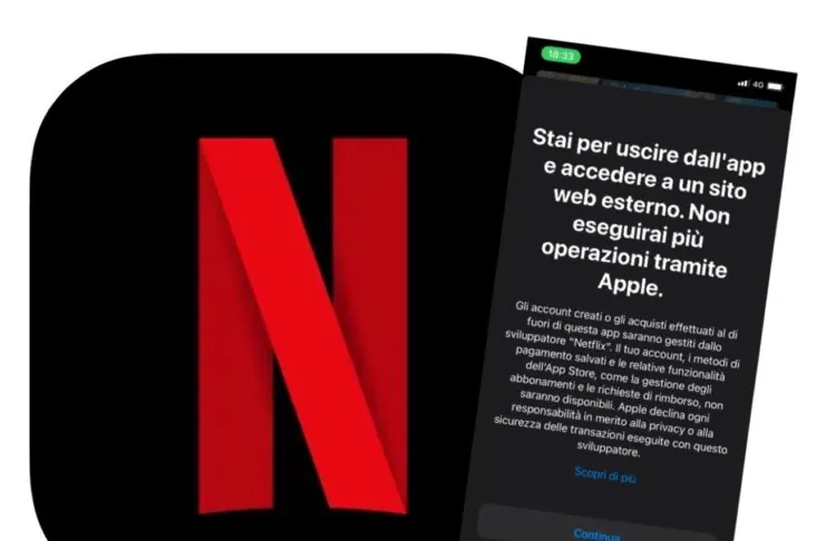 Stai per uscire dall’app e accedere a un sito web esterno. Non eseguirai più operazioni tramite Apple. Gli account creati o gli acquisti effettuati al di fuori di questa app saranno gestiti dallo sviluppatore “Netflix”. Il tuo account, i metodi di pagamento salvati e le relative funzionalità dell’App Store, come la gestione degli abbonamenti e le richieste di rimborso, non saranno disponibili. Apple declina ogni responsabilità in merito alla privacy o alla sicurezza delle transazioni eseguite con questo sviluppatore.
