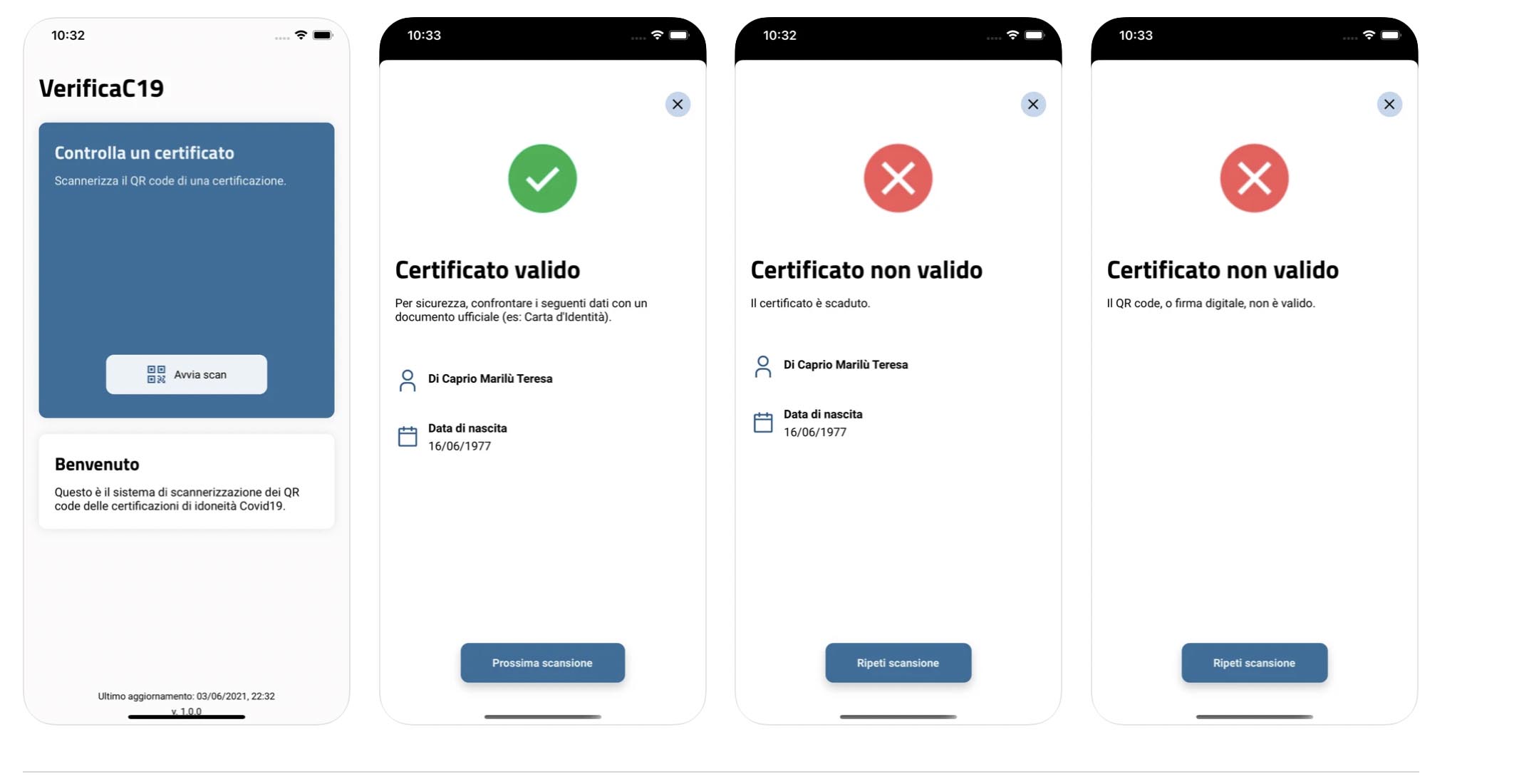• L’App VerificaC19 mostra graficamente al verificatore l’effettiva validità della Certificazione nonché il nome, il cognome e la data di nascita dell’intestatario della stessa.