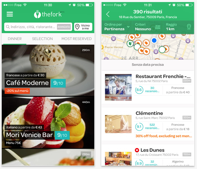 TheFork è il servizio di TripAdvisor che consente agli utenti di prenotare un ristorante direttamente dal sito o dall’applicazione sviluppata appositamente per iOS. L’applicazione permette di cercare e trovare un ristorante nella propria città, in base alla tipologia, all’ubicazione, alle caratteristiche e alle recensioni degli utenti. Una volta scelto sarà possibile prenotare il ristorante comodamente dalla app, scegliendo data ed orario. E’ possibile sfruttare anche il GPS per cercare i risultati vicini alla propria posizione, o navigare direttamente sulla mappa per verificare meglio le posizioni dei locali disponibili.