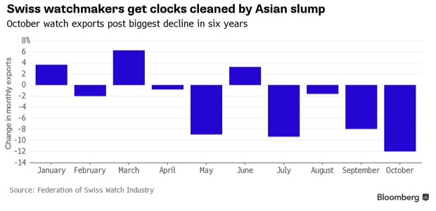 I numeri sono comunicati dall’Ufficio della Dogana svizzera, riportati da Bloomberg, mentre gli analisti indicano le due ragioni principali: il calo della domanda e delle vendite in Hong Kong, da anni uno dei mercati mondiali più attivi per la commercializzazione degli orologi svizzeri e anche il rafforzamento del franco svizzero, pari all’11% che dall’anno scorso erode margini e profitti.
