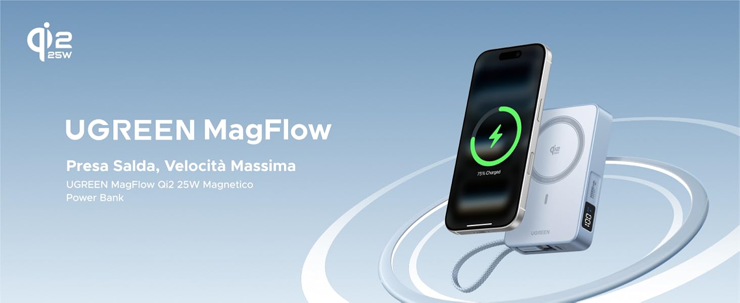 UGREEN Magflow Qi2 25W la segnaliamo perchè è una batteria con uscita da 30W che è quella che consigliamo come minimo per gli iPhone ma anche un caricabatterie wireless da 25W, un a delle pochissime porwerbank con questa specifica. La tecnologia Qi2.2 garantisce le massime prestazioni possibili per un iPhone 16 o 17, superiore ai 15W tradizionali dei MagSafe di prima generazione Il rivestimento antiscivolo e la gestione termica intelligente migliorano la sicurezza, insieme al modulo di riconoscimento automatico dei dispositivi. Si ricarica a 30W e ha 10mila mAh di capacità e ha anche un cavo integrato. Non è leggera nè piccolissima ma se sono le prestazioni ad interessare, c’è poco altro di concorrente.