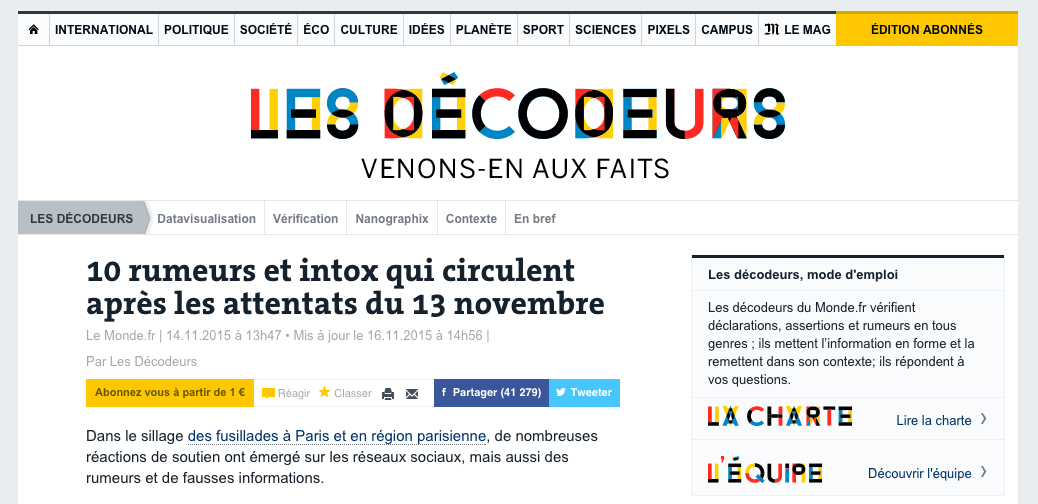 La smentita di Le Monde è stata pubblicata in un interessante articolo intitolato 10 rumeurs et intox qui circulent après les attentats du 13 novembre dove la testata smonta 10 notizie fasulle circolate online dopo gli attentati di Parigi.