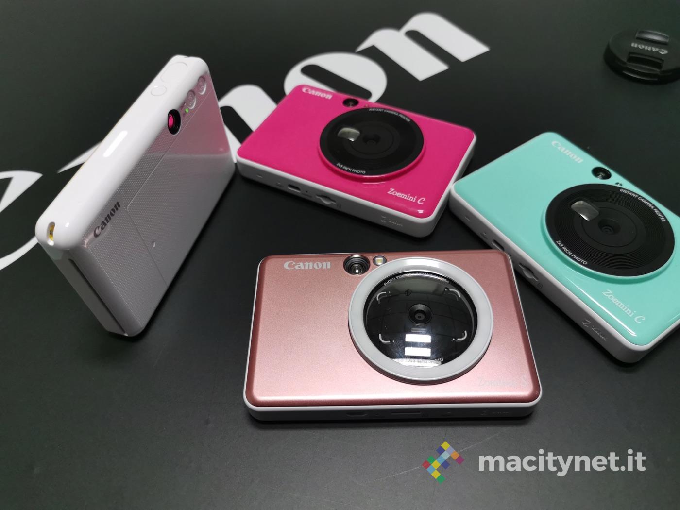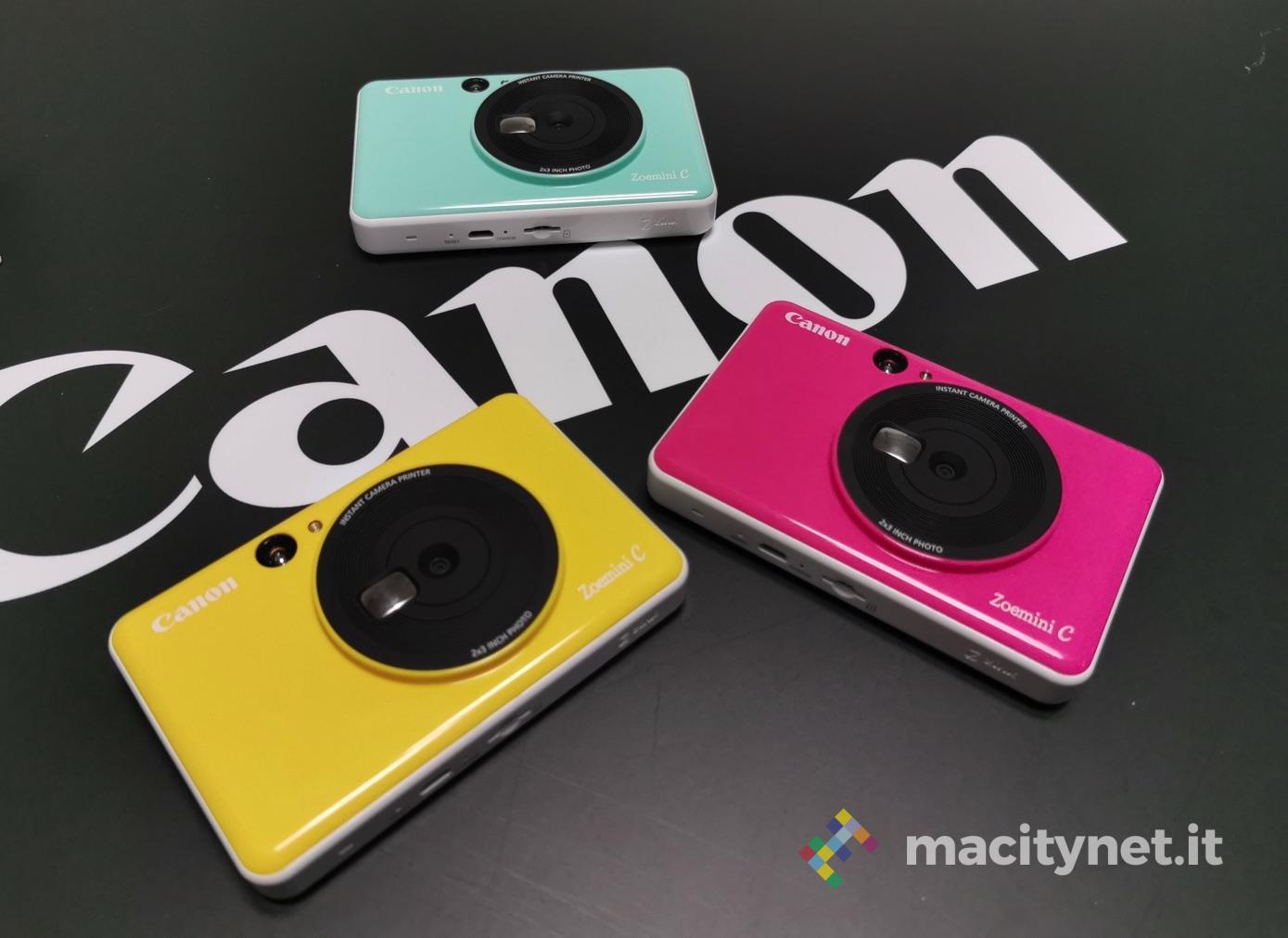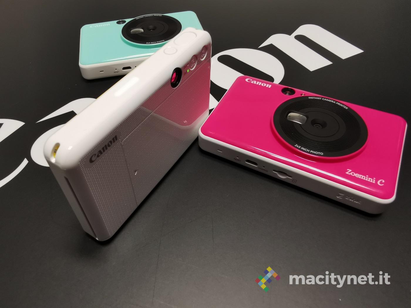 Il modello più semplice e colorato è Canon Zoemini C con un sensore da 5 megapixel, un piccolo specchio sul fronte per inquadrarsi nei selfie e uno slot per schede di memoria Micro SD. I colori di questo modello sono particolarmente vivaci: rosa brillante, giallo limone, verde menta e turchese.