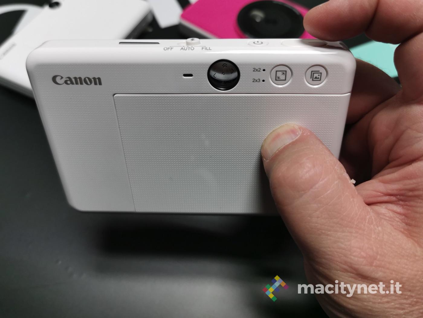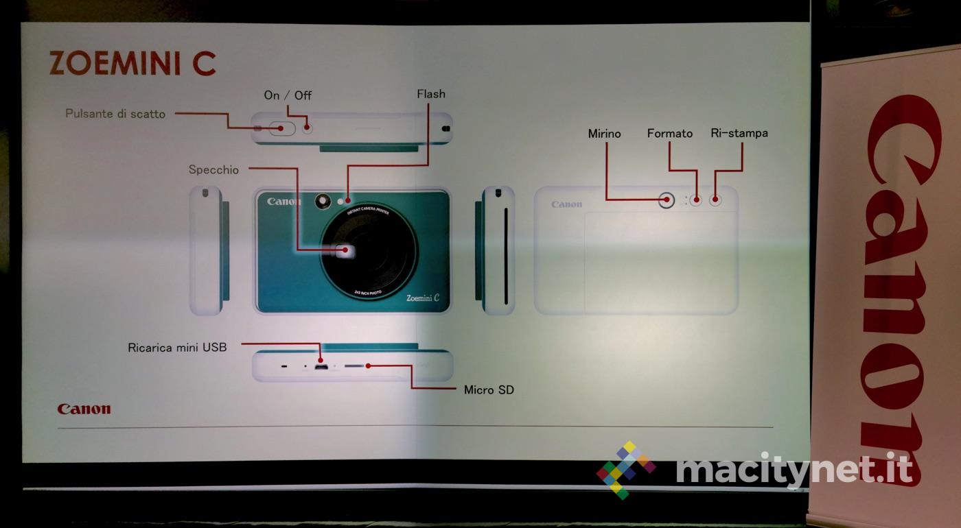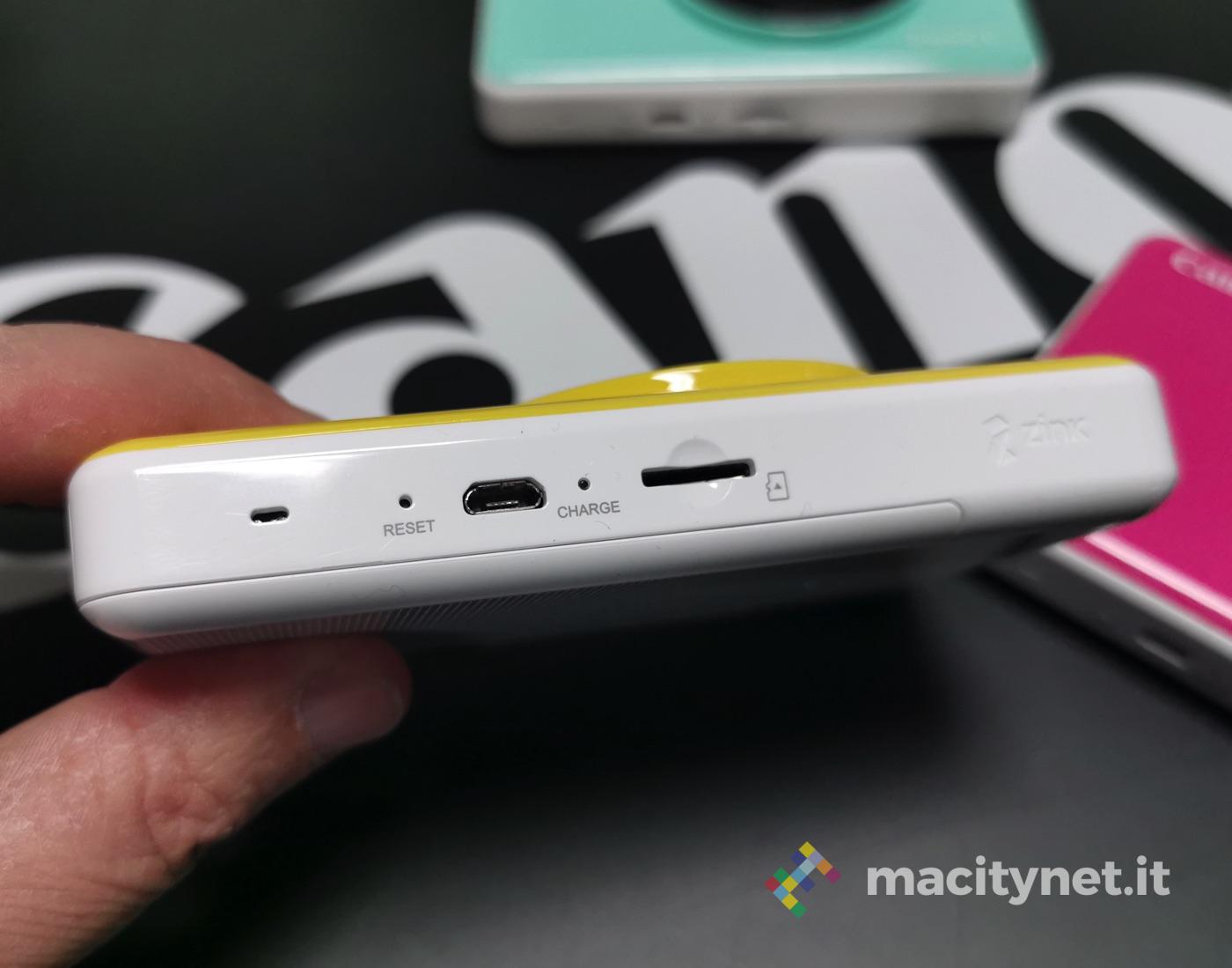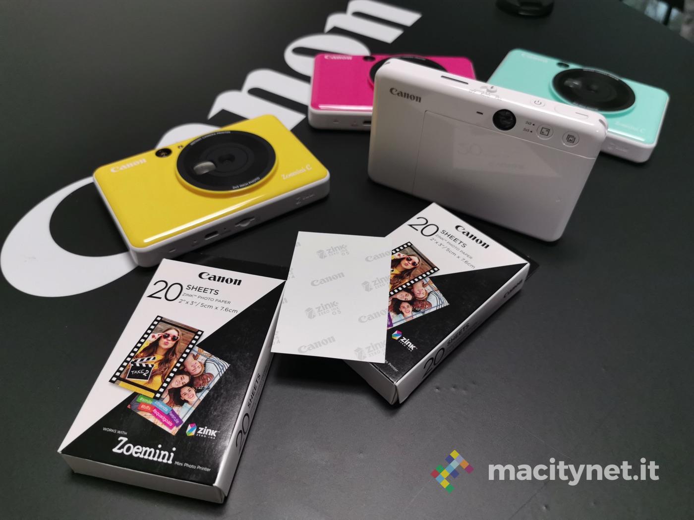 Il modello più semplice e colorato è Canon Zoemini C con un sensore da 5 megapixel, un piccolo specchio sul fronte per inquadrarsi nei selfie e uno slot per schede di memoria Micro SD. I colori di questo modello sono particolarmente vivaci: rosa brillante, giallo limone, verde menta e turchese.
