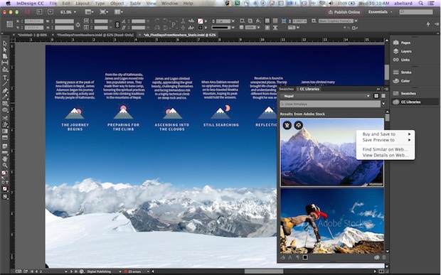Photoshop Fix offre funzioni di fotoritocco con particolare focus sul ripristino delle immagini da dispositivi mobili, mettendo a disposizione funzioni note quali li timbro clone e il filtro fluidifica. L’app Capture CC combina le funzionalità di Adobe Brush, Adobe Shape, Adobe Color e Adobe Hue in una singola app con la quale fare più cose insieme. Delle due nuove app mobile di Adobe abbiamo parlato più estesamente in questa pagina. Adobe ha anche rilasciato versioni aggiornate di alcune app mobile, incluse Photoshop Mix, Photoshop Sketch, Illustrator Draw, Comp CC e Premiere Clip. Sul versante design Adobe ha incluso nuove funzioni in Illustrator CC con strumenti quali Shaper, Live Shape e nuove guide avanzate. InDesign CC integra nuove funzioni per l’online publishing e una versione Preview di Adobe Fuse CC 3D è ora inclusa nei piani di abbonamento della Creative Cloud. Questo modellatore 3D integra funzioni di sincronizzazione con supporto per le librerie Creative Cloud e Photoshop CC.