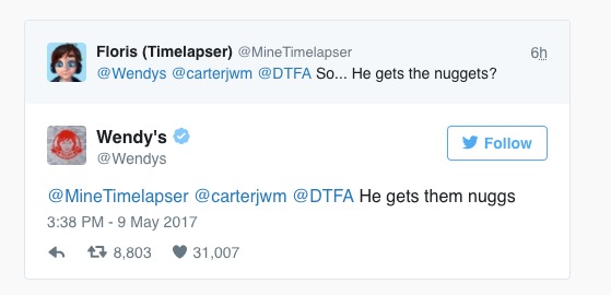 La vicenda risale al mese di aprile, quando il 16enne Carter Wilkerson del Nevada aveva chiesto a Wendy’s quanti tweets avrebbe dovuto ottenere per guadagnare una fornitura annuale di pepite di pollo da parte dell’azienda. La catena di fast food ha risposto “18 milioni”, un sfida apparentemente impossibile, ma accettata da Wilkerson. La personale campagna dell’intrepido adolescente ha guadagnato rapidamente visibilità tanto da raggiungere già ora una cifra che forse Wendy’s non avrebbe mai pensato.