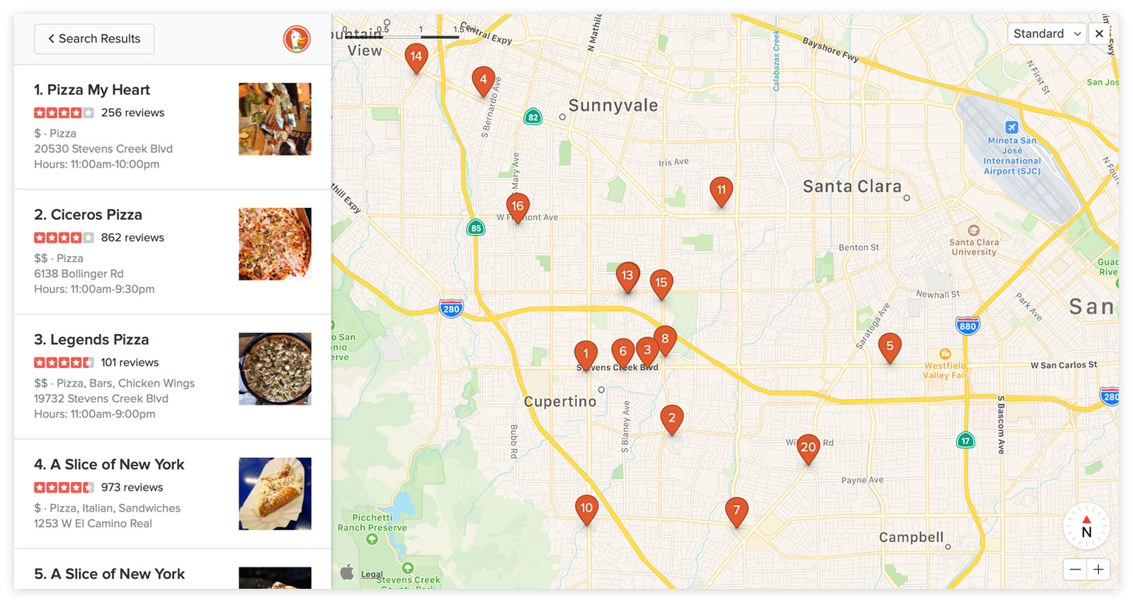 Cercando in DuckDuckGo un’espressione come “Pizza in Cupertino”, la mappa appare come un modulo tra i risultati di ricerca. Un click sull’immagine mostrata in alto a destra tra le ricerche consente di ingrandire e visualizzare la mappa in modo esteso. Nella visualizzazione ingrandita è possibile fare click su singoli elementi per ottenere ulteriori dettagli e le indicazioni per arrivare alla destinazione selezionata. Varie le possibili ricerche che è possibile effettuare: un indirizzo, un luogo geografico, un’impresa locale, una tipologia di attività, luoghi nelle vicinanze.