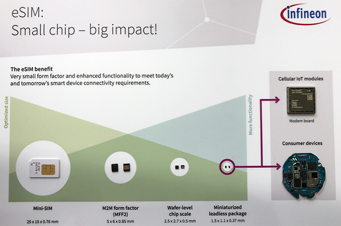 Al MWC di Barcellona Infineon ha mostrato chip la gestione delle eSIM, processori minuscoli (1,5 x 1,1 x0,37 mm) progettati con tecnologie a 14nm pensati per l’integrazione in dispositivi di minuscole dimensioni (alcuni dei quali ancora devono ancora arrivare sul mercato), utilizzabili anche nell’ambito delle applicazioni M2M (machine to machine).