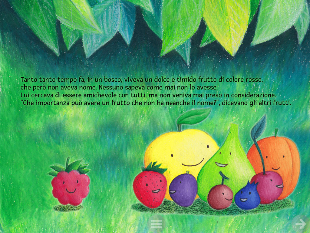 I bambini saranno catapultati nel mondo magico della natura accompagnati da Biancaneve terrorizzata dalla frutta, una fragola che scopre l’origine dell’arcobaleno, una romantica storia d’amore tra i frutti del bosco e da un lampone velocissimo. Con pochi tap potranno sfogliare i libri interattivi, scoprire le simpatiche animazioni e lasciarsi aiutare da mamma e papà nella lettura delle storie del bosco.