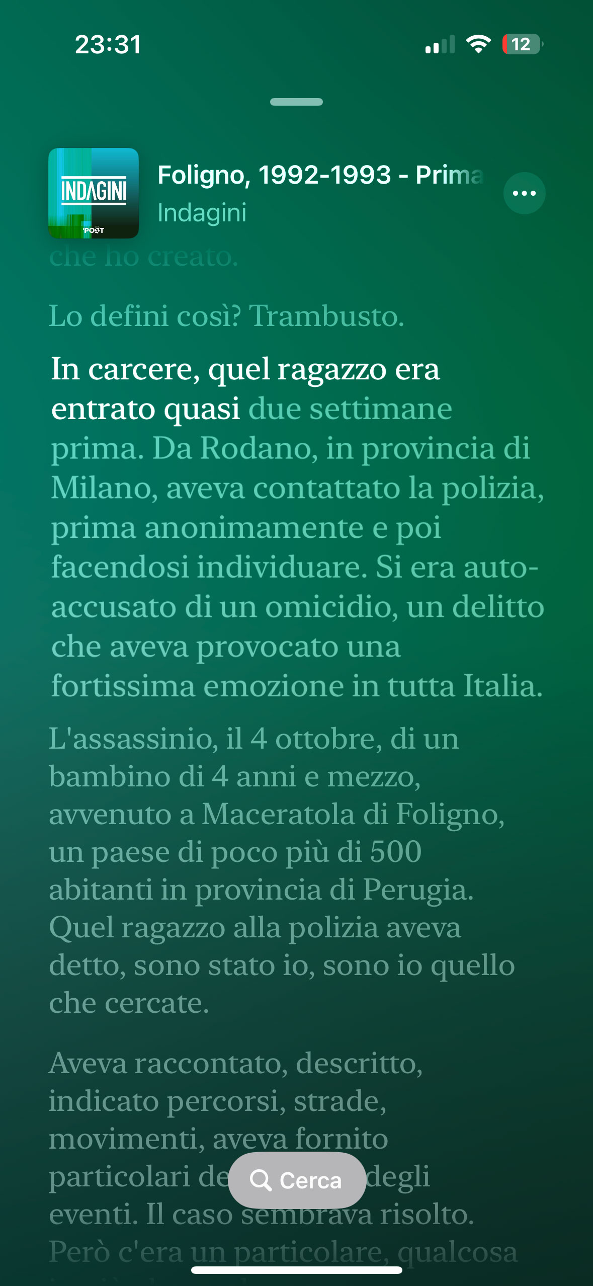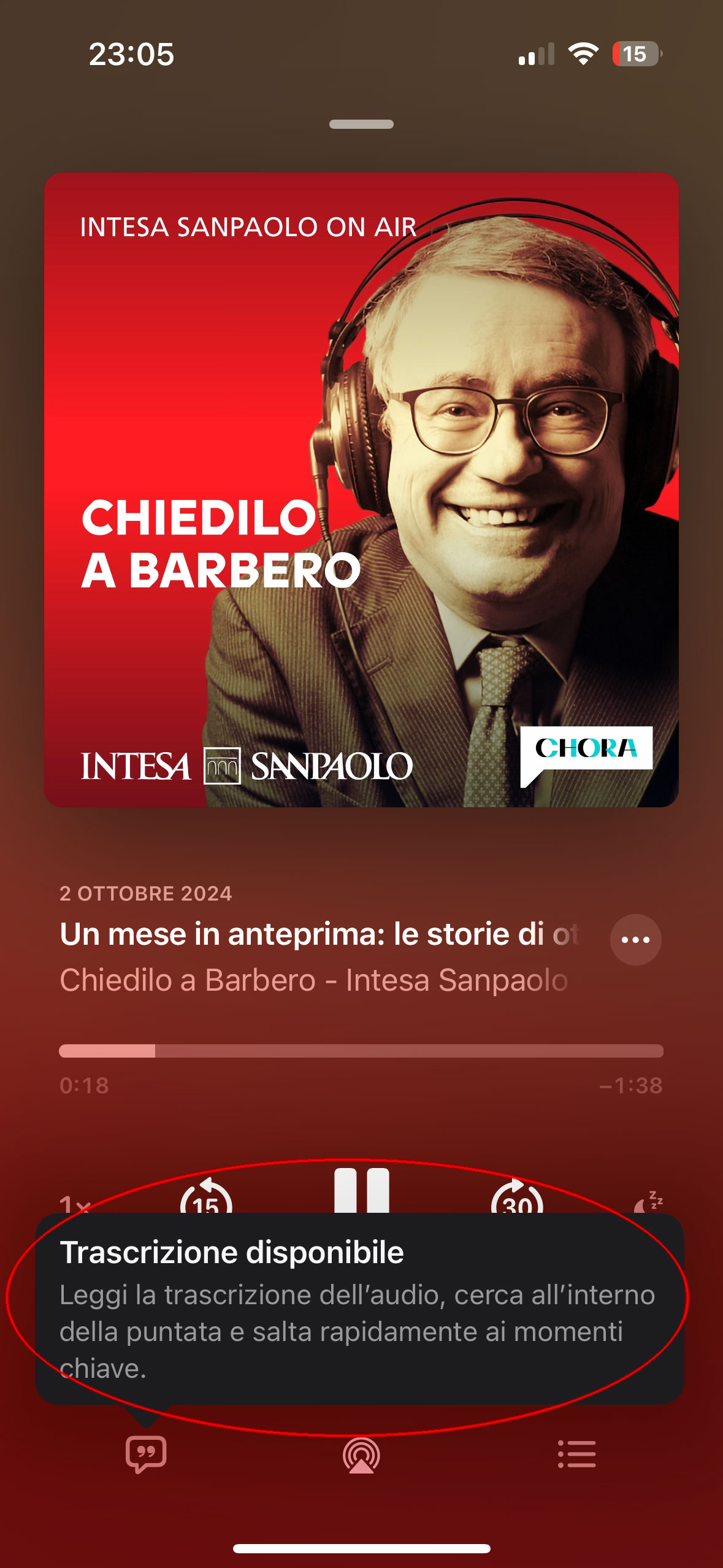 Grazie alle trascrizioni è possibile leggere il testo completo di un episodio, cercare parole o espressioni specifiche all’interno dell’episodio e fare tap sul testo per riprodurre il podcast da quel punto esatto. Durante la riproduzione ogni parola viene evidenziata, così è più facile seguire l’episodio.