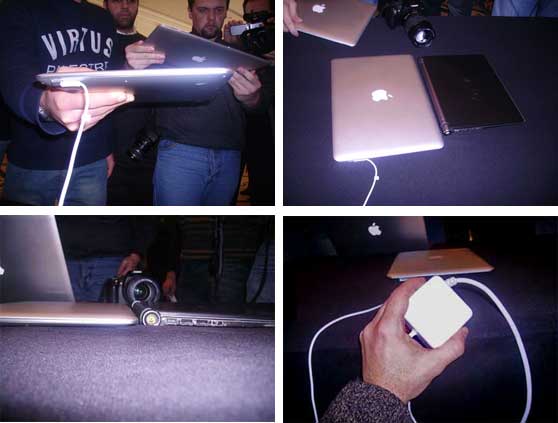 Nelle foto sotto: a partire dall’alto da sinistra: giornalisti con i mano i nuovi MacBook Air; un Air a confronto con un Vaio; sotto a sinistra, confronto di spessore; a destra, l’alimentatore (piccolo come quello di un iPod) del nuovo MacBook Air