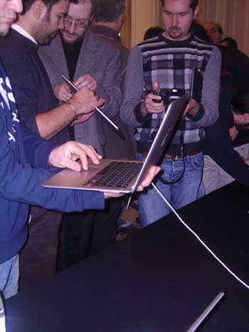 Terminata la presentazione ufficiale l’eccitazione della platea era palpabile: tutti i presenti non vedevano l’ora di poter mettere le mani sull’Air e possiamo subito dire che foto, filmati e spot pubblicitari non rendono giustizia al sistema. Meglio: dal vivo MacBook Air risulta ancora più piccolo, sottile, leggero ed estremamente elegante di quanto già non sembri sui media.