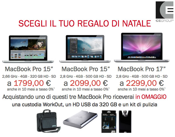 Interessante offerta anche per MacBook Pro da 13″ a 1.149 euro: chi ne acquista uno può ricevere un disco fisso esterno da 320GB aggiungendo solo 1 euro alla spesa totale. Infine ricordiamo il triplo regalo di Natale per chi acquista MacBook Pro da 15″ e da 17″: per le tre configurazioni disponibili gli acquirenti ricevono in regalo una custodia WorkOut, un disco fisso esterno da 320GB e anche un kit di pulizia. Ricordiamo che per tutte le offerte descritte è possibile dilazionare il pagamento in 10 mesi a tasso zero.