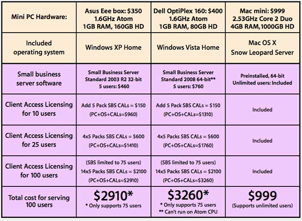 Nella versione server del Mac Mini il superdrive è stato eliminato mettendo al suo posto il disco rigido da 500GB aggiuntivo (totale 1 TB). Il piccolo cubetto da 16,5 x 16,5cm x 5,08cm pesa solo 1,31Kg e si rivela un piccolo gioiellino in numerosi ambiti e l’ideale per piccoli gruppi di lavoro. Una tabella stilata da Appleinsider consente di verificare l’effettiva convenienza della soluzione server rispetto a soluzioni analoghe basate su Windows XP Home o Windows Vista Home (le versioni più economiche di Windows): Mac OS X Snow Leopard Server è l’unico a consentire di serie l’accesso di un numero illimitato di utenti Mac e PC senza costi di licenza per client.