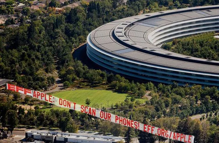 Per protestare contro il paventato sistema ideato da Apple che prevedeva meccanismi con i quali individuare su iCloud e in iMessage materiale pedopornografico, l’Electronic Frontier Foundation (EFF) – organizzazione non profit rivolta alla tutela dei diritti digitali e della libertà di parola nel contesto dell’odierna era digitale – nell’ambito dell’ultimo keynote della Mela del 14 settembre ha fatto volare un aereo sull’Apple Park (e sull’altro quartier generale a 1 Infinte Loop di Cupertino) con uno striscione, sul quale era riportato il messaggio: “Apple: Don’t scan our phones! EFF.ORG/APPLE” (Apple non scandagliare i nostri telefoni, e il link al sito dell’organizzazione).