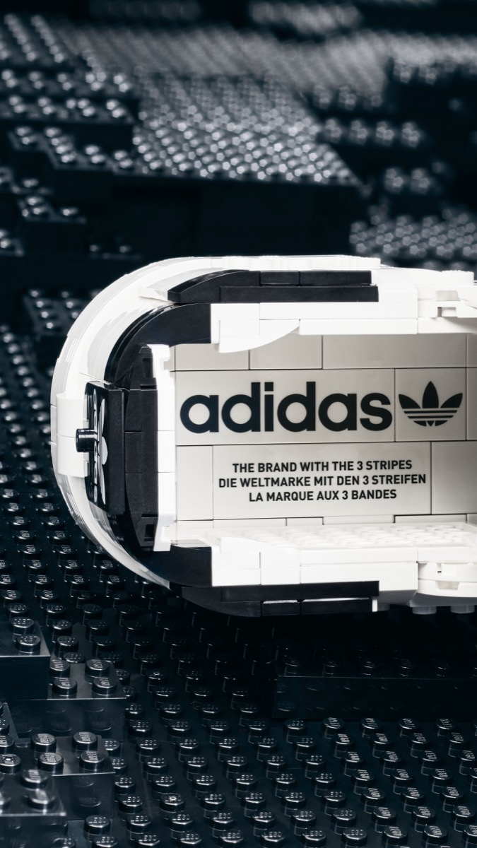 La costruzione enfatizza gli elementi iconici di entrambi i marchi, così che il risultato restituisce l’estetica iconica di adidas, con quella degli inconfondibili mattoncini del marchio LEGO.