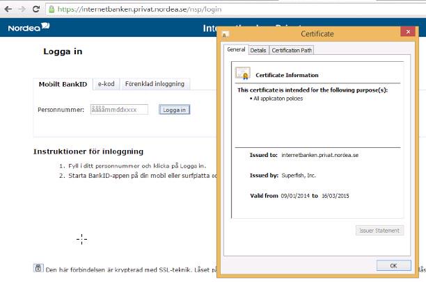 Hopkins ha comunque preso le difese di Superfish spiegando che «Aiuta gli utenti a trovare e scoprire nuovi prodotti visivamente» ed «analizza istantaneamente le immagini sul web presentando offerte di prodotti identici o simili ma che sono venduti a prezzi più bassi» aggiungendo inoltre che gli utenti hanno la possibilità di rifiutare i termini e le condizioni del software quando attivano il computer per la prima volta, il che si traduce nella disattivazione del software in questione fin dal primo avvio. Stando a quanto segnalano altri utenti, l’adware effettivamente, se attivato, viene autorizzato a curiosare anche su connessioni sicure, come quelle che si possono avere durante l’accesso a siti web bancari, autocertificazione confermata dallo screenshot che segue.