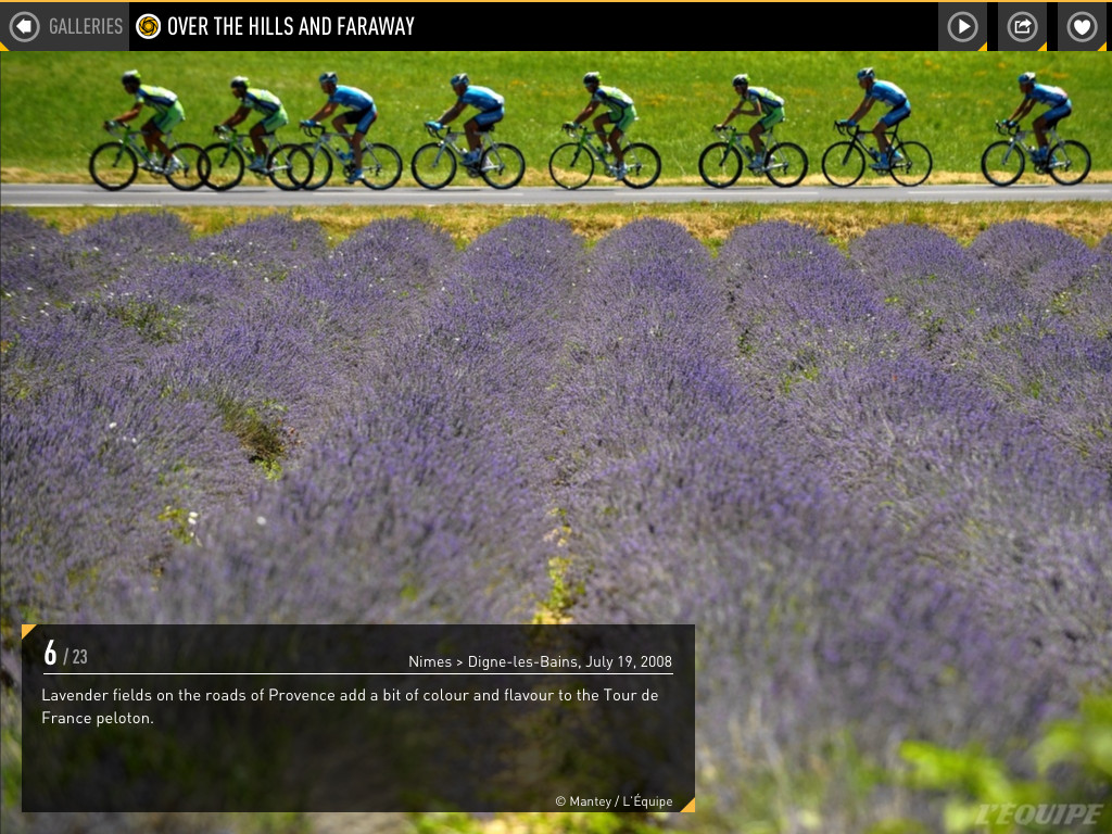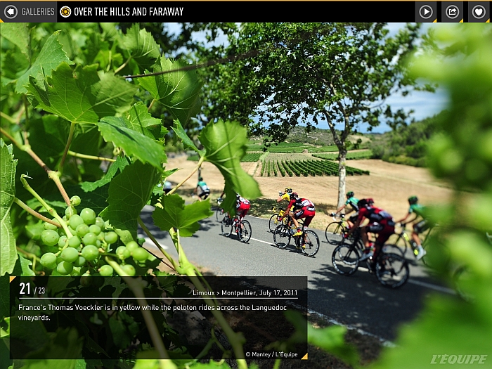 Come dice anche il titolo, lo sviluppatore è proprio “L’Equipe”, il più diffuso quotidiano sportivo francese, che della corsa è l’organizzatore. E dunque il punto di vista è tipico d’Oltralpe: non sono i campioni a fare il Tour, non è il ciclismo a fare il Tour: è il Tour a fare i campioni, è il Tour a fare il ciclismo. Quindi, nessuna celebrazione di grandi personaggi del passato e di eroi in bicicletta, piuttosto una narrazione per immagini della quotidianità della Carovana: un prete che aiuta un corridore caduto, un carretto trainato da un cavallo che lascia passare il plotone, Bernard Thevenet che scherca con uno scimpanzé in bici, Jacques Anquetil che passa la giornata di riposo pescando. Senza dimenticando gli scatti più suggestivi, ma meno interessanti, perché si trovano un po’ ovunque sul web e sulle riviste: la carovana che passa nei campi di girasole, gli scatti in salita, la festa a Parigi.