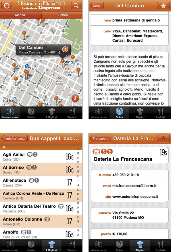 L’appuntamento con la buona cucina e la tradizione culinaria italiana torna quest’anno su iPhone e touch sotto forma della nuova edizione della guida I Ristoranti d’Italia 2010. Realizzata dal Gruppo Editoriale Espresso è proposta a 7,99 euro su App Store, pronta per tutti i buon gustai dotati di iPhone e iPod touch.