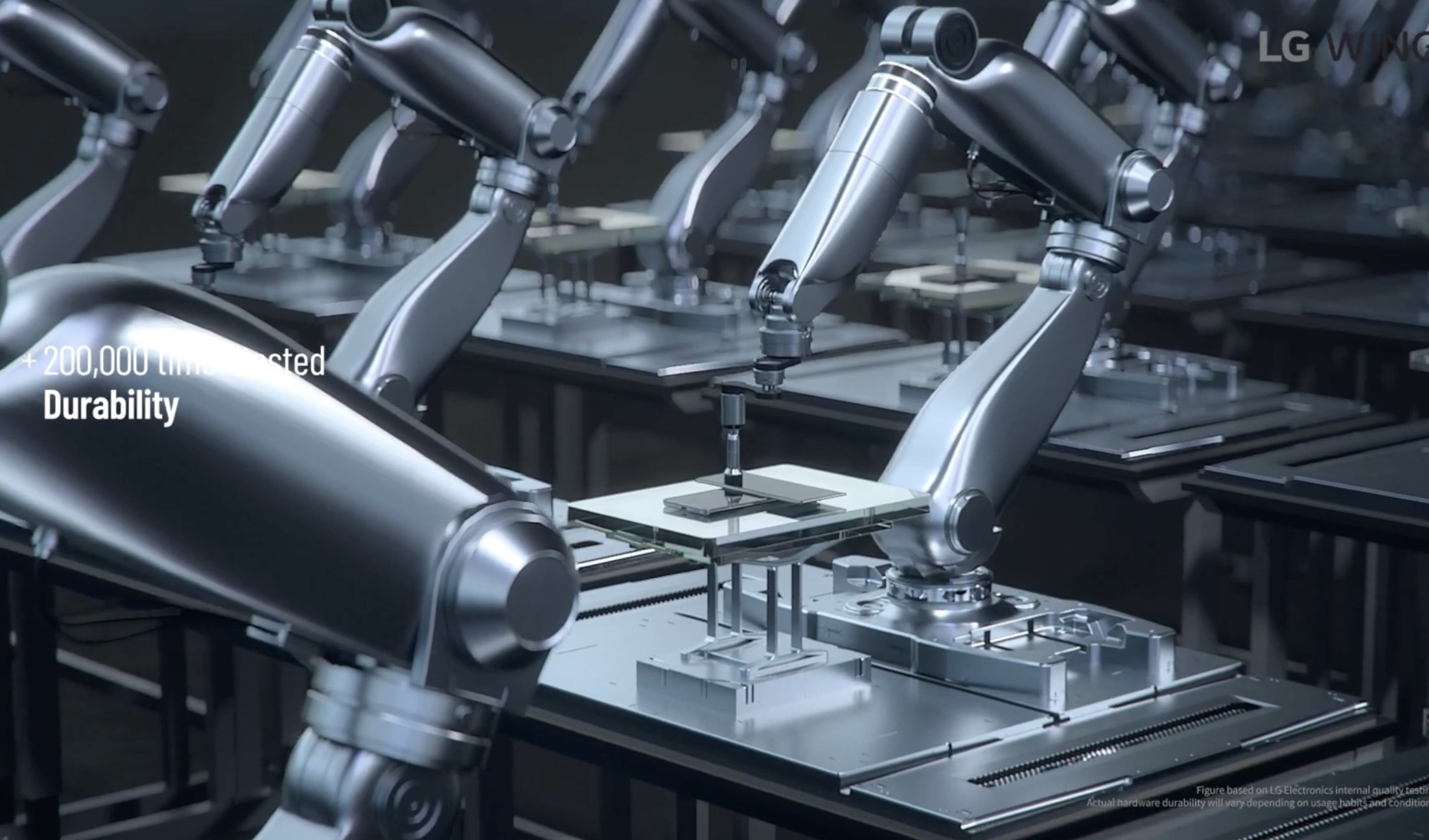 Un altro esempio di qualità produttiva riguarda il modulo cerniera con ammortizzatore idraulico, che riduce lo stress sul meccanismo quando lo schermo principale viene aperto. Sul retro dello schermo principale, inoltre, è stato applicato uno strato di poliossimetilene termoplastico per facilitare la rotazione e prevenire eventuali graffi sul secondo schermo. Il meccanismo a cerniera di LG WING è stato testato oltre 200.000 volte per confermarne l’affidabilità.