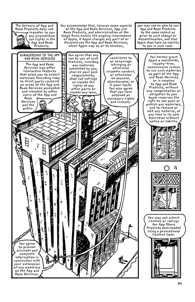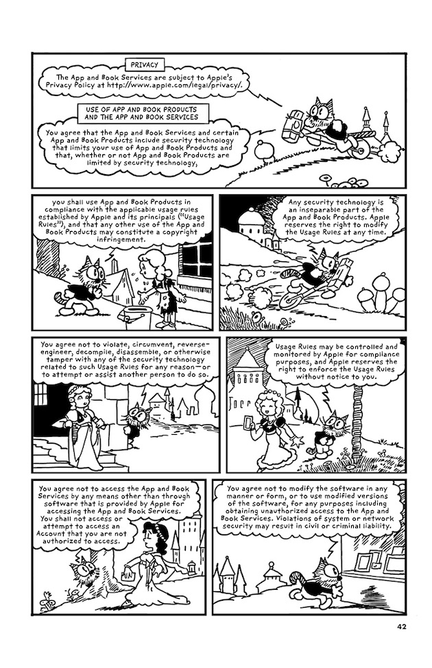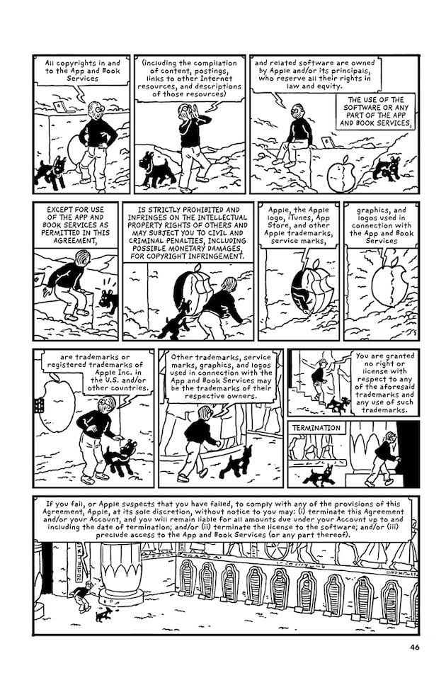Leggere le condizioni di utilizzo di computer e programmi è sempre molto noioso e non lo fa nessuno (o quasi): le licenze d’uso di Apple non fanno eccezione. Per rendere la procedura più interessante si potrebbero sfruttare… i fumetti. È l’idea un po’ folle ma divertente che ha avuto il fumettista R. Sikoryak che sul suo Tumblr mostra la licenza d’uso di iTunes usando Steve Jobs come protagonista.