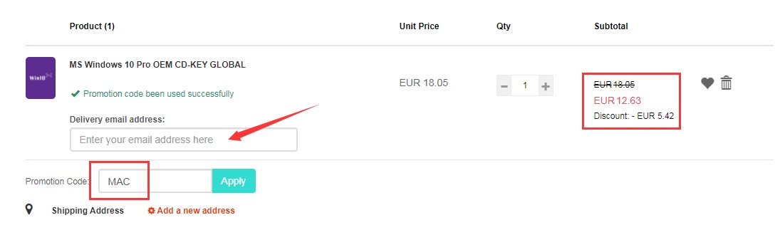 Una volta aggiunto al carrello (tasto Acquista Ora), prima di confermare l’ordine, dovrete inserire il codice MAC nella casella “Codice promozionale” e cliccare su “Applicare”. Vedrete lo sconto applicato.