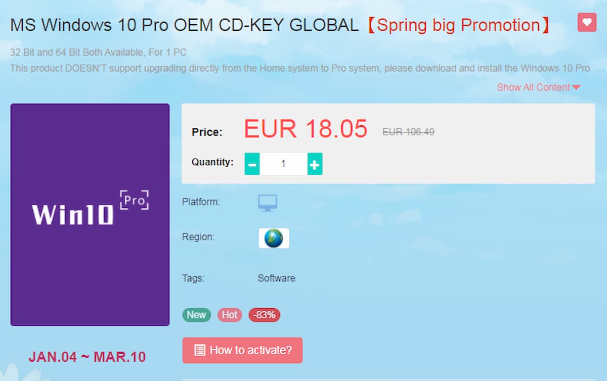 Windows 10 Pro OEM KEY a 12.64EUR (dopo il 30% di sconto con coupon MAC)