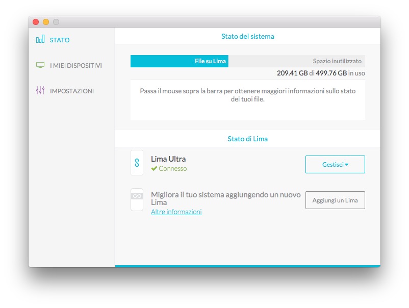 Finita la procedura Lima crea un disco virtuale, che noi usiamo come fosse un normale disco connesso al Mac: quando copiamo uno o più file o cartelle, il sistema inizia la sincronizzazione verso il disco (il tutto avviene in modo molto trasparente) e modifica la cache locale.