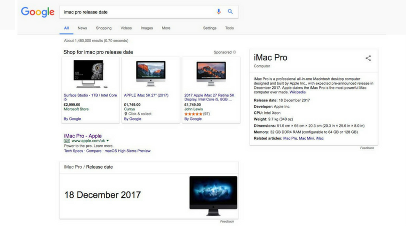 Quando arriverà il nuovo iMac Pro? Annunciato a giugno di quest’anno, all’epoca Apple aveva specificato che l’arrivo sul mercato era previsto “per dicembre”. Cercando su Google la data specifica di uscita di iMac Pro, viene segnalata la data del 18 dicembre. Qualcuno anche su Wikipedia ha indicato la data in questione. Data plausibile? Nessuno può saperlo ma è probabile che Apple metterà in vendita il nuovo potente computer tutto in uno circa una settimana prima di Natale, perfetto per chi stava aspettando la macchina in occasione delle prossime festività.