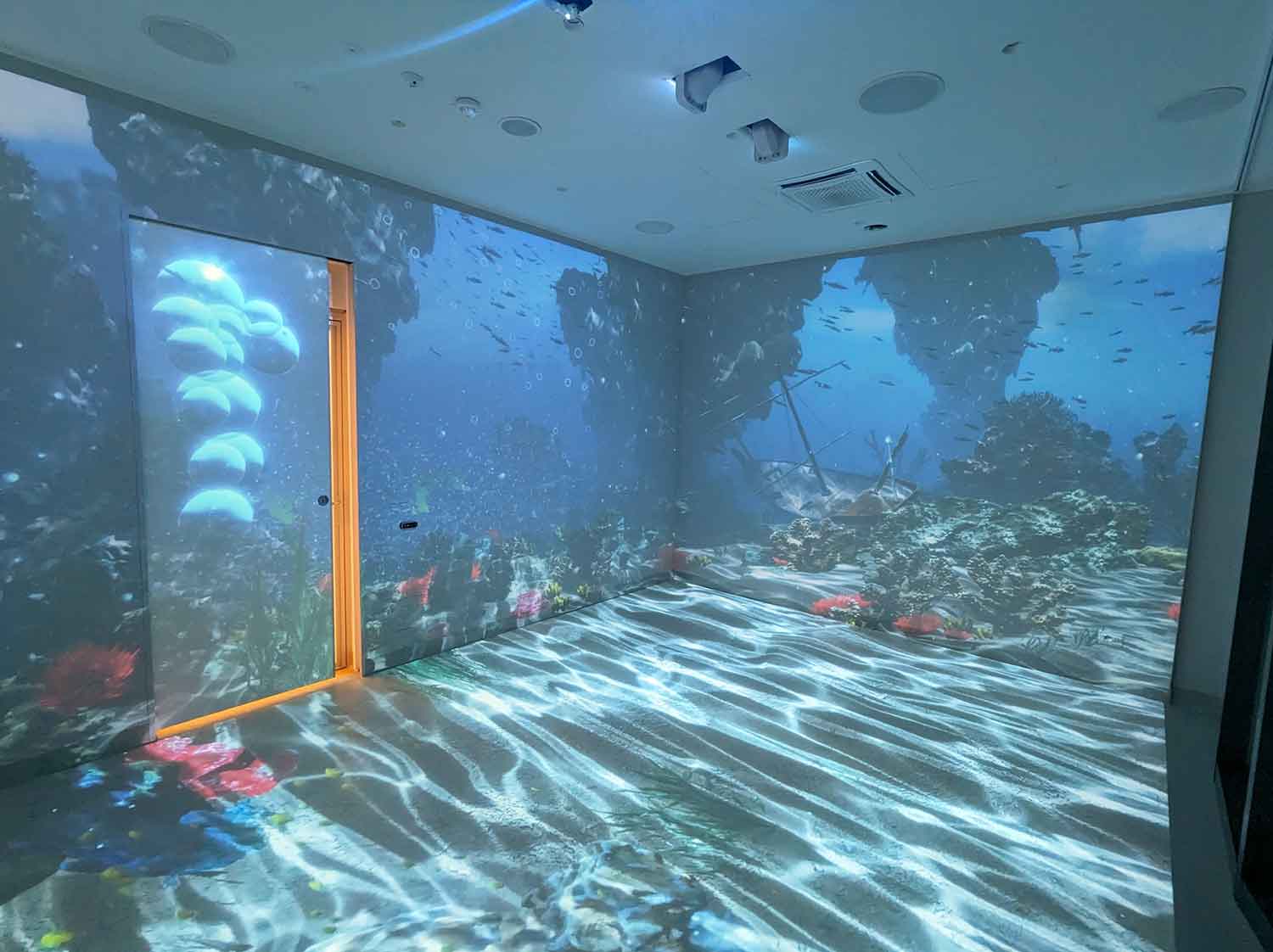 Sulle pareti sono stati impiegati i videoproiettori Epson EB-PU1006W da 6.000 lumen dotati di ottica ultracorta: è stato possibile posizionarli molto vicino alle pareti, ottenendo una proiezione immersiva totale, fluida e senza ombre generate dalle persone presenti nella stanza.
