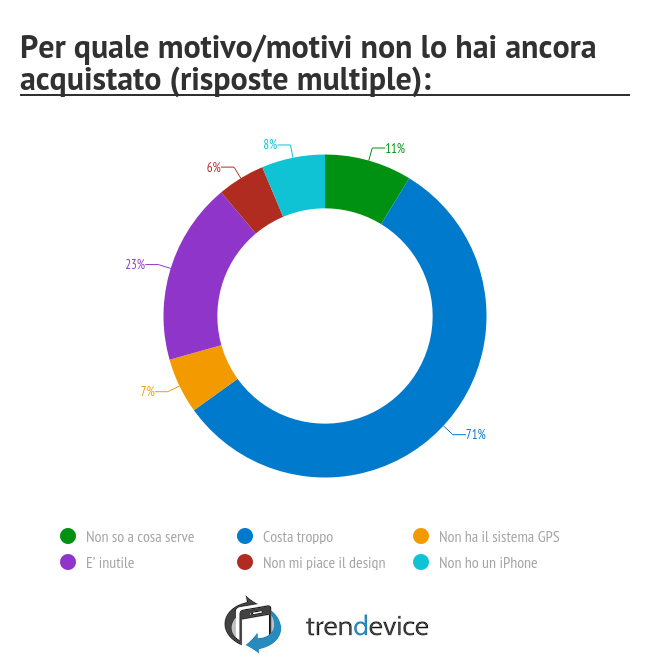 Le risposte mostrano dati sorprendenti, a cominciare dalla confusione relativa al nome dell’orologio. Cresce, anche tra i consumatori fidelizzati Apple, la percentuale degli utenti convinti che l’orologio Apple si chiami iWatch (23%), a fronte di chi lo chiama correttamente, ma sempre più a malincuore, Apple Watch (76%). Percentuali che cambiano, ma solo leggermente, se si pone lo stesso quesito a chi già possiede l’orologio Apple (iWatch per il 16% ed Apple Watch per l’84% dei proprietari). Tra i motivi del mancato acquisto, alcuni consumatori ammettono candidamente di non capire ancora bene a cosa serve Apple Watch (11%), dal momento che non sostituisce completamente l’iPhone, altri indicano come causa la mancanza del sistema GPS (7%), lo trovano inutile (23%) o non amano il design (6%), ma è sicuramente il costo ad incidere maggiormente (per il 71% costa troppo ma si dichiara disponibile a valutare l’usato).