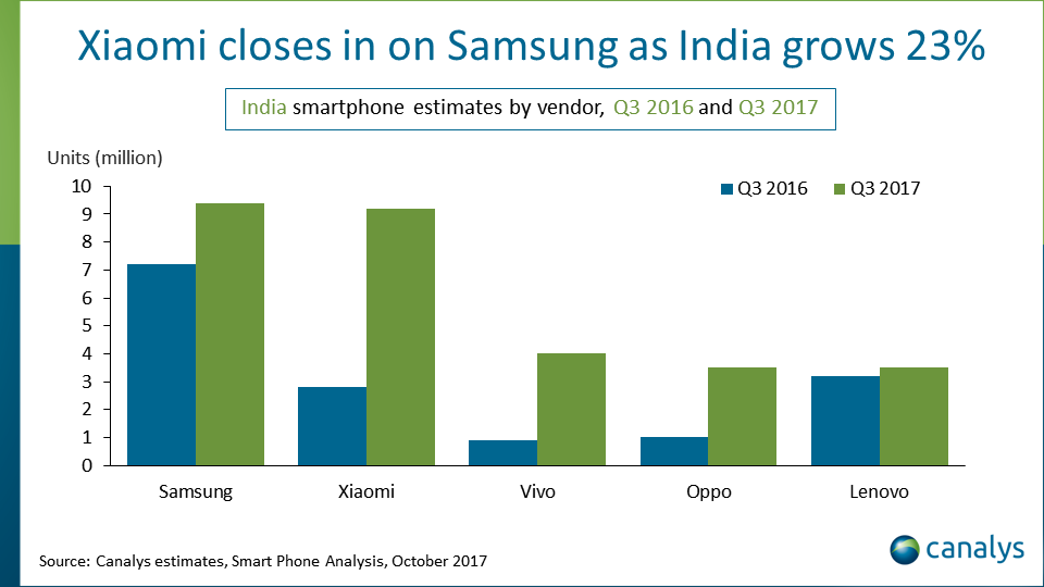 In India a farla da padrone sono Samsung e Xiaomi le quali hanno spedito rispettivamente 9.4 milioni e 9.2 milioni di unità, e che in pratica hanno a loro disposizione quasi la metà del market share per quanto riguarda i primi cinque vendor.