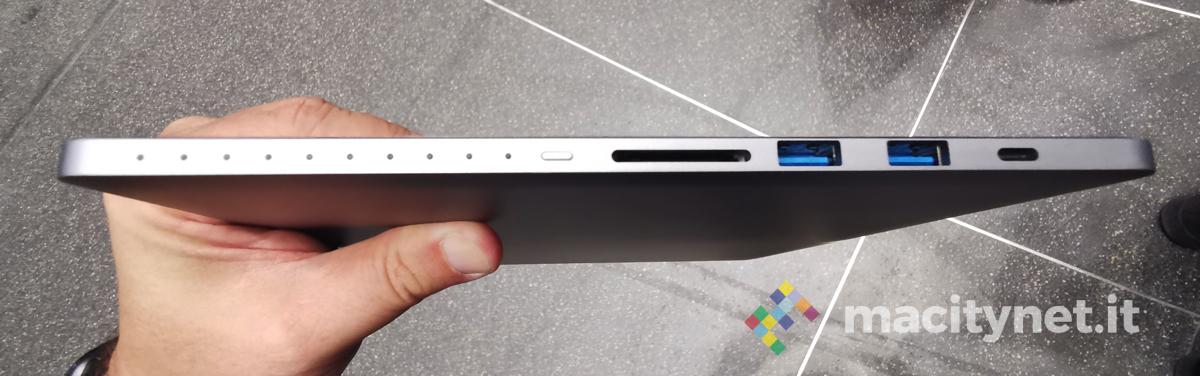 Linedock si collega a MacBook Pro 15” mediante uno speciale connettore USB-C a forma di U dal profilo ridotto. Sui lati mette a disposizione porta HDMI, due porte USB-C, lettore di schedine di memoria SD Card, porte USB 3.