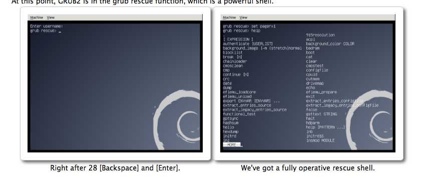 Hector Marco e Ismael Ripoli spiegano che premendo 28 volte il tasto Backspace al prompt di Grub (dalla versione 1.98 di dicembre 2009 fino alla 2.02 di dicembre 2015), viene richiamato una “shell di recovering”. La shell in questione offre vari strumenti ai più esperti, consentendo di accedere alla macchina senza bisogno di autenticazione e caricare l’ambiente operativo. Dopo l’avvio dell’ambiente operativo è ovviamente possibile installare un rootkit, sfogliare le risorse locali e predisporre attacchi di vario tipo.