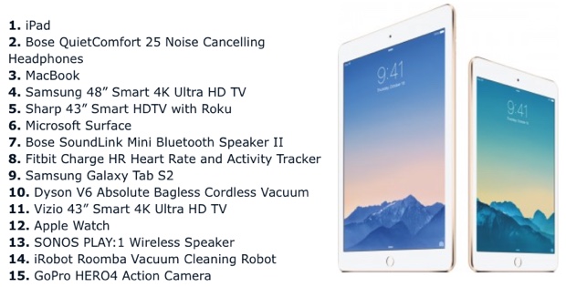 Gli statunitensi si preparano per le festività, così non può mancare una ricerca di mercato sui regali di Natale tecnologici più desiderati. Come succede ormai da diversi anni a questa parte i prodotti Apple hanno un ruolo di primo piano, a cominciare da iPad che al primo posto domina l’elenco compilato da Best Buy, principale catena USA per gli acquisti tecnologici. Al secondo posto troviamo le nuove cuffie Bose QuietComfort 25 con cancellazione del rumore, mentre al terzo posto un altro prodotto Apple: MacBook.