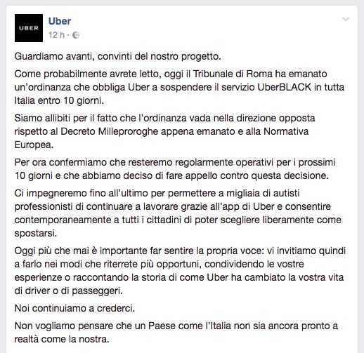 “Siamo allibiti per il fatto che l’ordinanza vada nella direzione opposta rispetto al Decreto Milleproroghe appena emanato e alla Normativa Europea” commenta Uber la notizia sulla sua pagina ufficiale Facebook. “Per ora confermiamo che resteremo regolarmente operativi per i prossimi 10 giorni e che abbiamo deciso di fare appello contro questa decisione.”