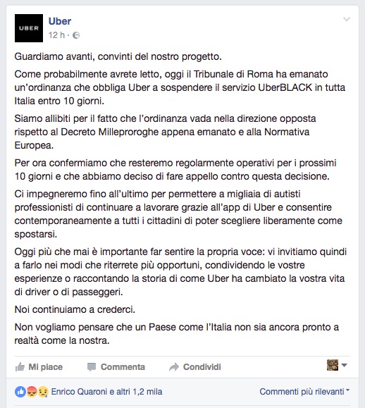 “Siamo allibiti per il fatto che l’ordinanza vada nella direzione opposta rispetto al Decreto Milleproroghe appena emanato e alla Normativa Europea” commenta Uber la notizia sulla sua pagina ufficiale Facebook. “Per ora confermiamo che resteremo regolarmente operativi per i prossimi 10 giorni e che abbiamo deciso di fare appello contro questa decisione.”