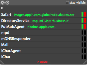 Tutto il traffico in uscita e in entrata viene anche segnalato con una barra che appare nel menù. Usando le opzioni è anche possibile fissare regole specifiche per il traffico, determinare nuove regole per quelle vecchie o cancellare autorizzazioni. In più è anche possibile osservare il traffico su rete locale. Da notare che Little Snitch è in grado anche di fissare regole “temporanee” (autorizzazioni per una sola volta o fino alla chiusura dell’applicazione) o regole definitive e di scegliere le porte su cui comunicare