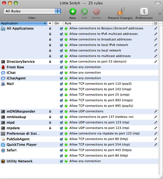 Come ci si aspetta da un programma scritto per il Mac Little Snitch pur monitorando e occupandosi della gestione delle comunicazioni verso l’esterno, è stato creato per facilitare e non per complicare la vita dell’utente. Fin dal primo avvio Little Snitch visualizza una finestra in cui vengono individuati in modo completamente automatico i programmi presenti sul nostro Mac che richiedono il collegamento con l’esterno per il loro funzionamento. Ognuno di questi è indicato con il nome, il tipo di servizio e la porta TCP utilizzata infine per ognuno è già pronta per noi una regola che ne consente il funzionamento.