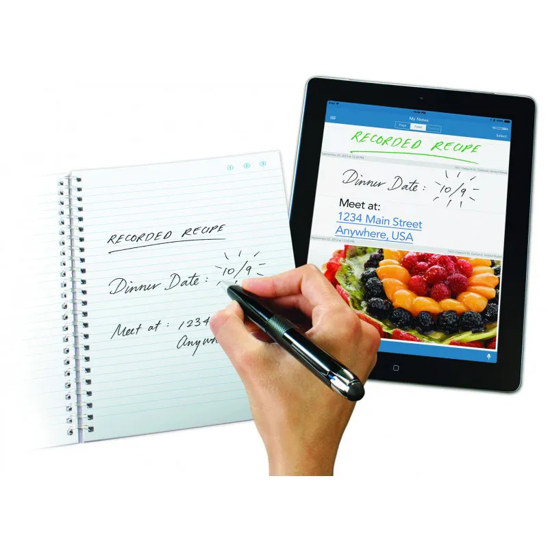 La penna non è una delle tante “punte” che si usano per digitalizzare testo. Al contrario è una vera e propria penna con tanto di cartuccia ad inchiostro che scrive su carta. La differenza con una penna vera e propria è che è connessa via Bluetooth e trasferisce dentro ad iPad o iPhone il testo che andremo fisicamente a scrivere su un blocco note speciale e lo farà in tempo reale. Una volta collocato dentro ad un dispositivo digitale il testo può essere archiviato in taccuini virtuali, oppure trasformato in PDF o inviato ad un word processor perchè il software leggerà la nostra scrittura trasformandola in testo corrente. In aggiunta a questo è anche in grado di creare dei cosiddetti Pencast, ovvero di attivare la funzione di registrazione audio sul dispositivo e di sincronizzare quel che scriviamo con l’audio. In termini pratici potremo riascoltare quel che è stato detto in corrispondenza di un certo punto dei nostri appunti scritti toccando semplicemente una parola o uno schizzo.