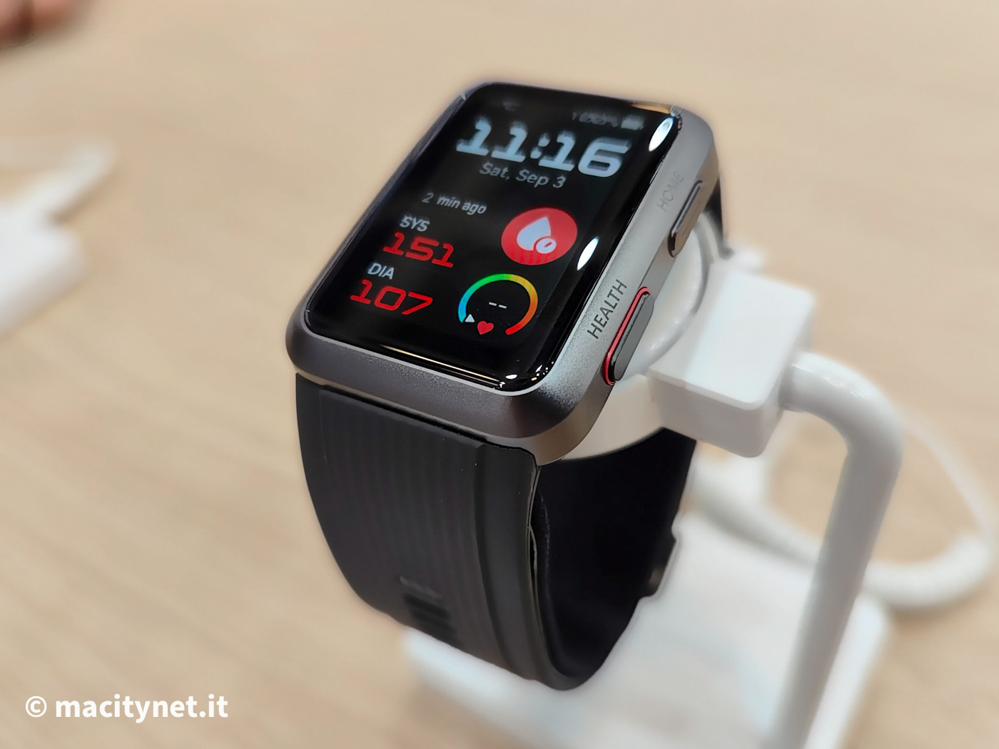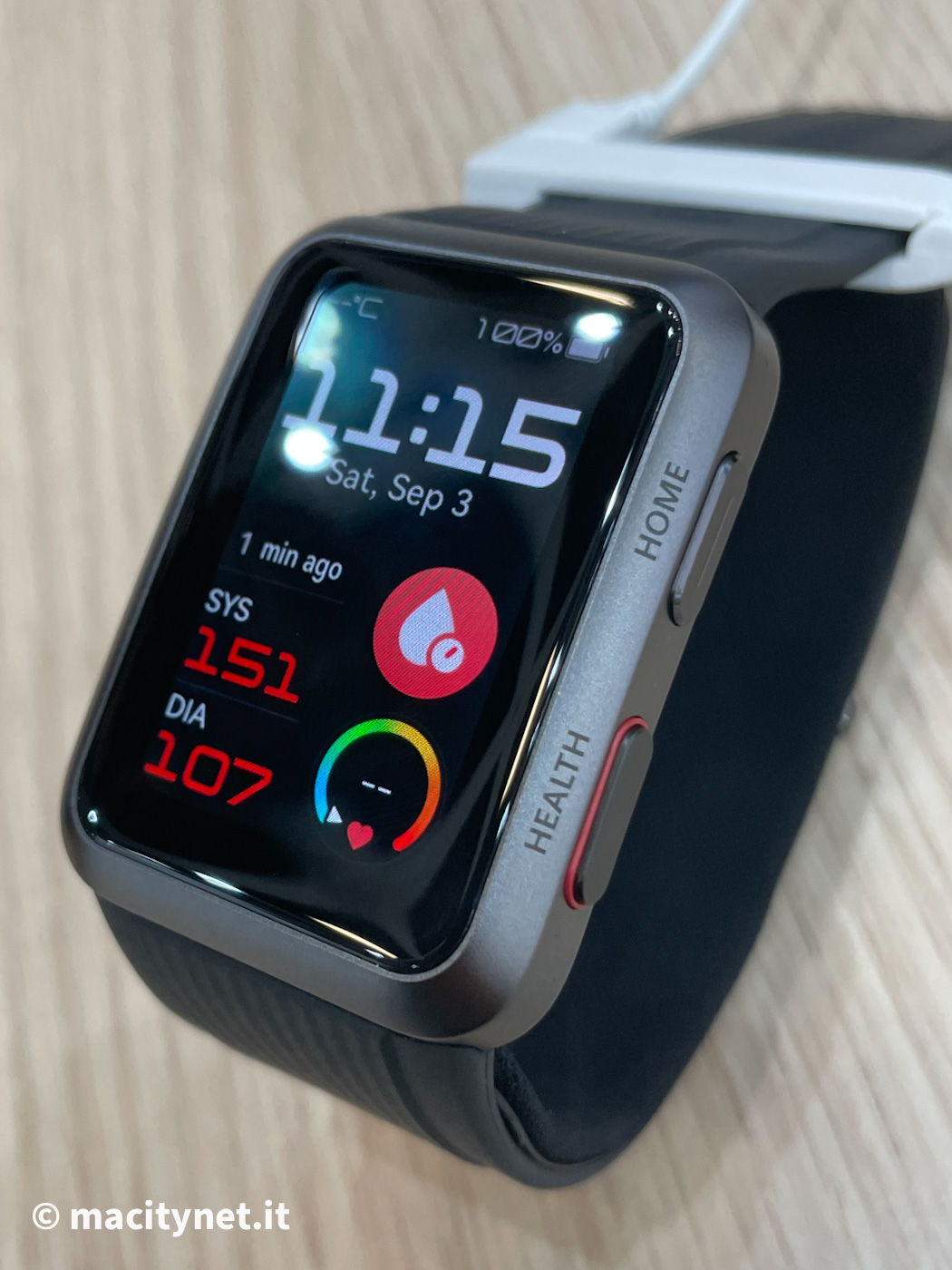 Annunciato il 2 Settembre e presente nel grande stand Huawei ad IFA lo smartwatch per la misurazione precisa della pressione sanguigna in tempo reale dal semplice nome WATCH D che coniuga il rilevamento dei dati biometrici ormai standard negli accessori da polso con le funzioni extra di un misuratore di pressione combinato con ECG  per registrare il ritmo e l’attività elettrica del cuore.