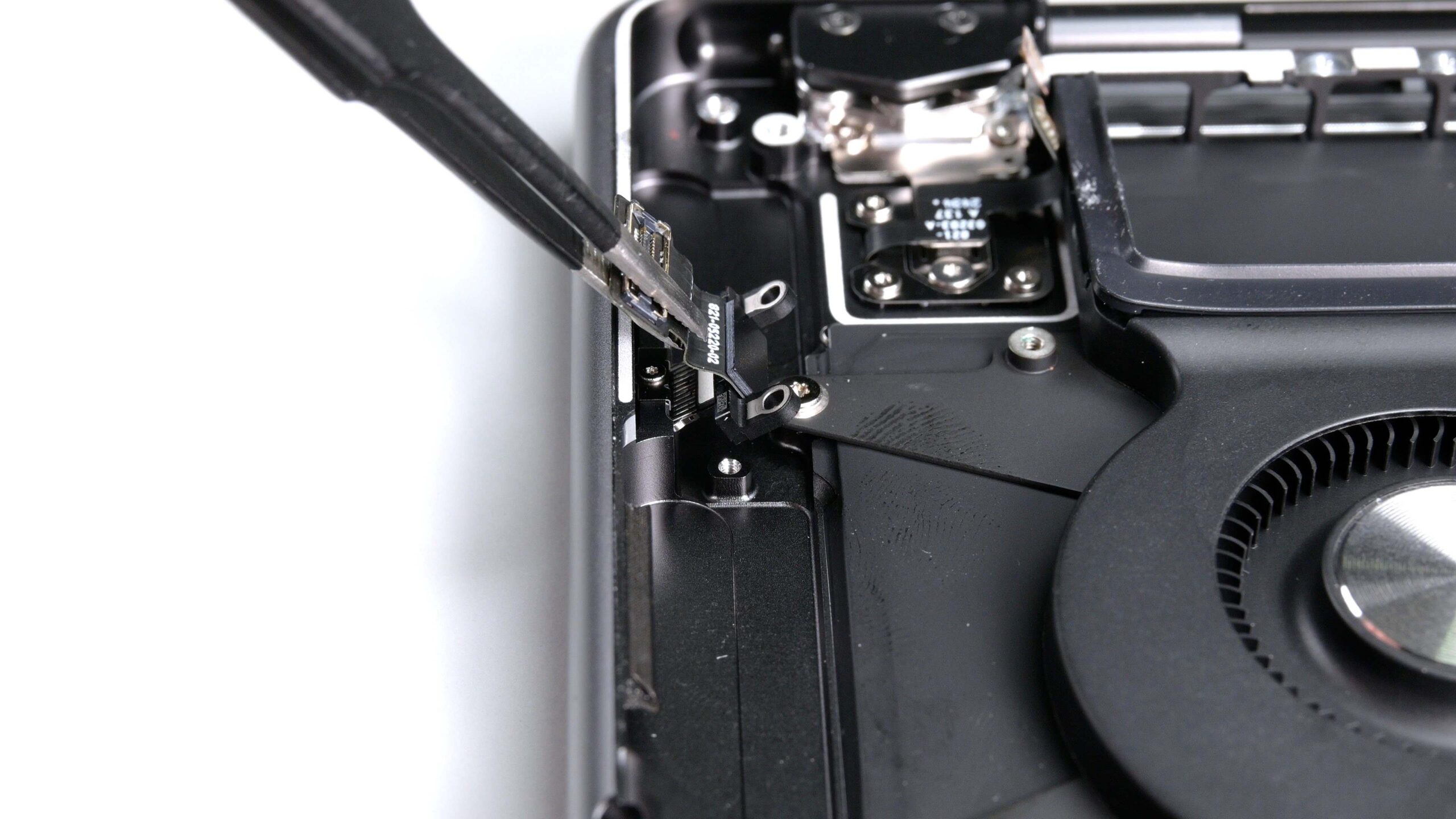 Proseguendo con il teardown si notano i connettori ZIF per i microfoni MEMS (microelettromeccanici) e uno degli speaker, i cavi per la ventola, la tastiera e l’altro speaker. Si passa poi al connettore del touch ID, a quello del display.