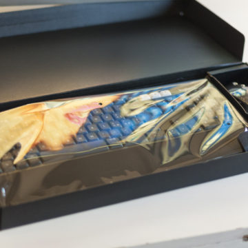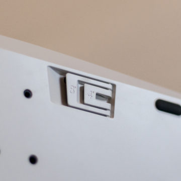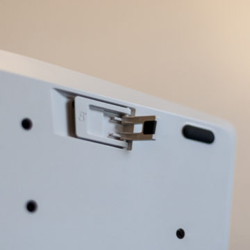 Una volta installata la tastiera, abbiamo notato subito come la forma sia importante sulla scrivania: l’inclinazione si può personalizzare grazie ai quattro piedini diversi sul retro, che consentono tre posizioni (sdraiata, alzata di 13 o di 23 mm), e la comodità di scrittura è garantita anche da un morbido cuscinetto posto alla base, che accompagna il palmo della mano quando non impegnato con i tasti.