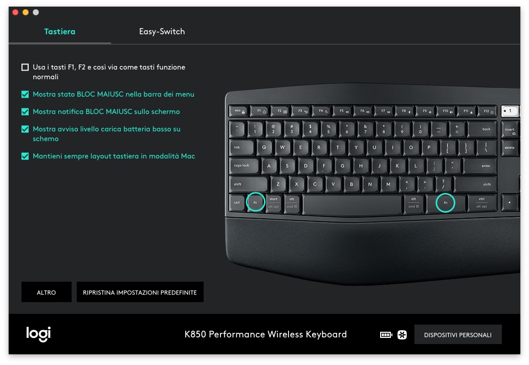 Interessante, ma non è una novità, la scelta di Logitech di optare per la segnalazione del blocca maiuscole software: nonostante la luce sulla tastiera (un po’ defilata), un avviso sul display di attivazione o disattivazione del blocco (è necessario installare i driver prima), che accompagna quello di esaurimento batterie.