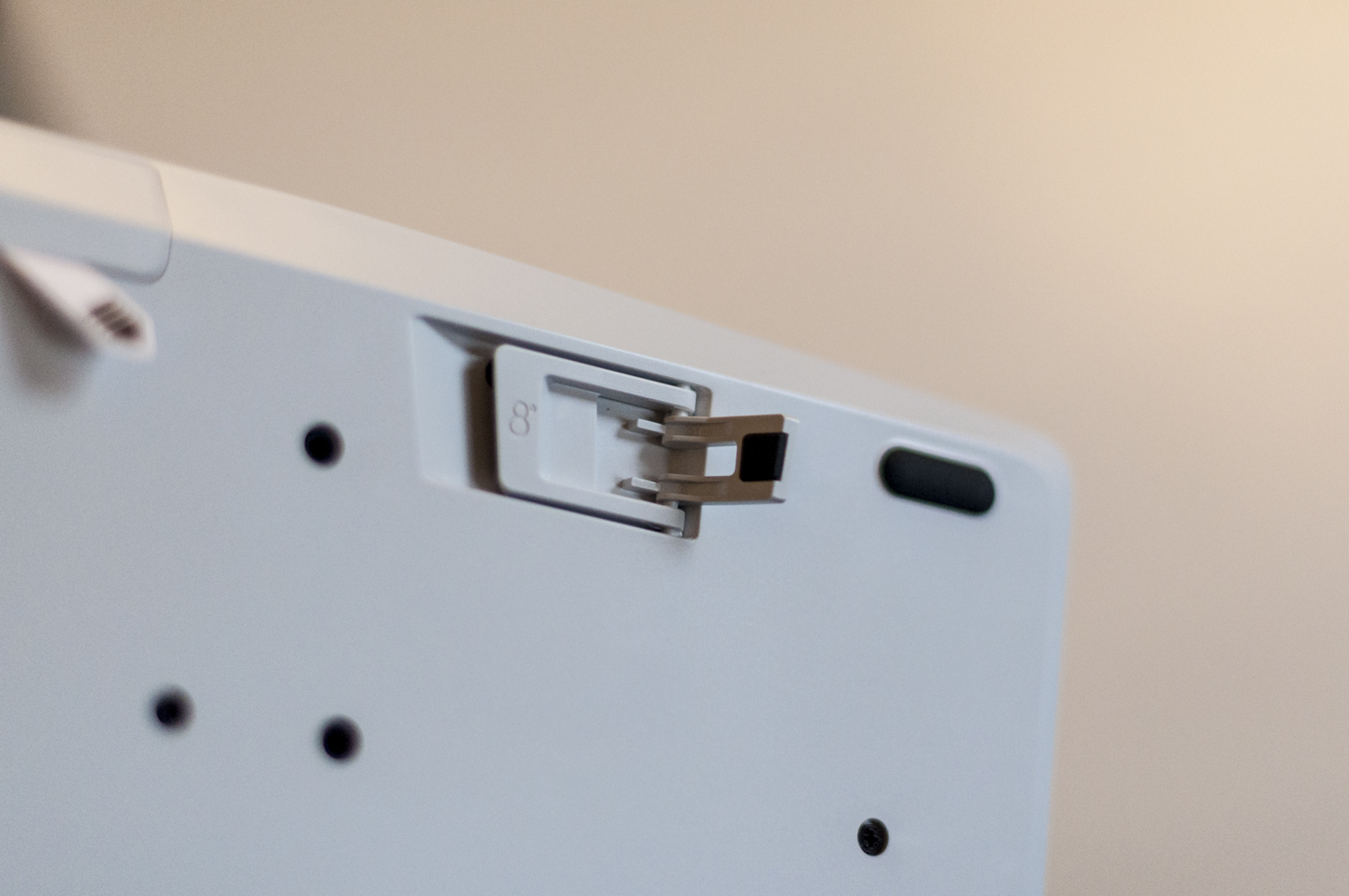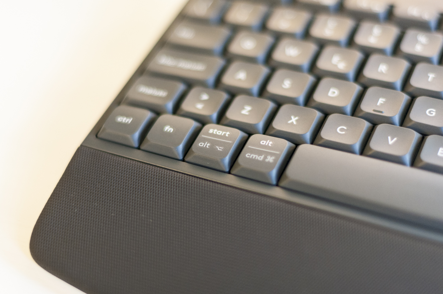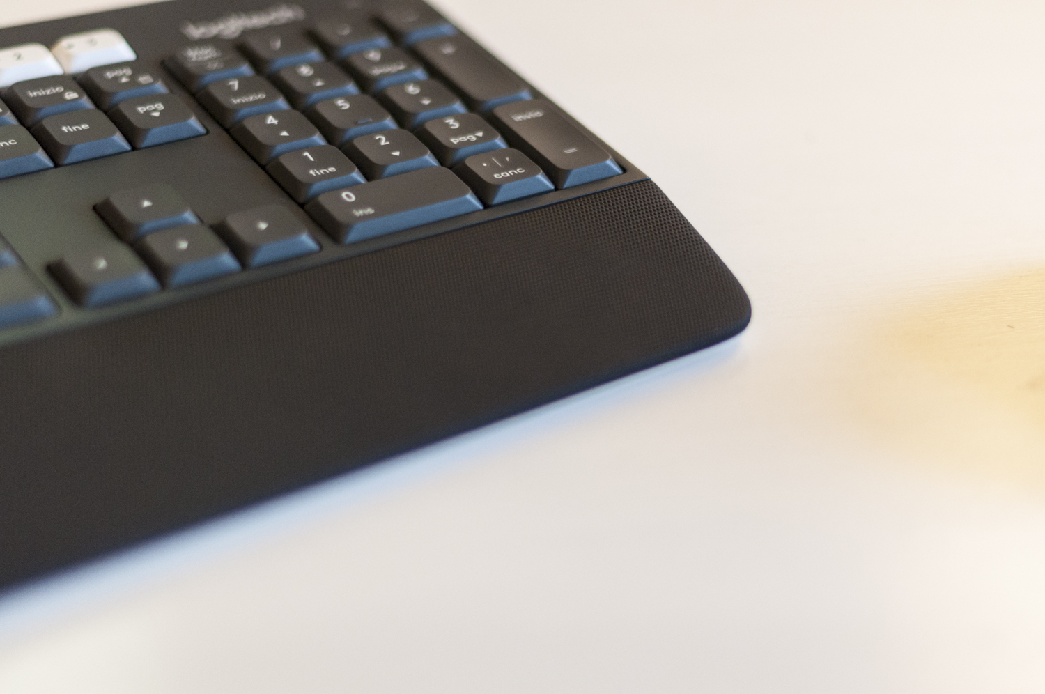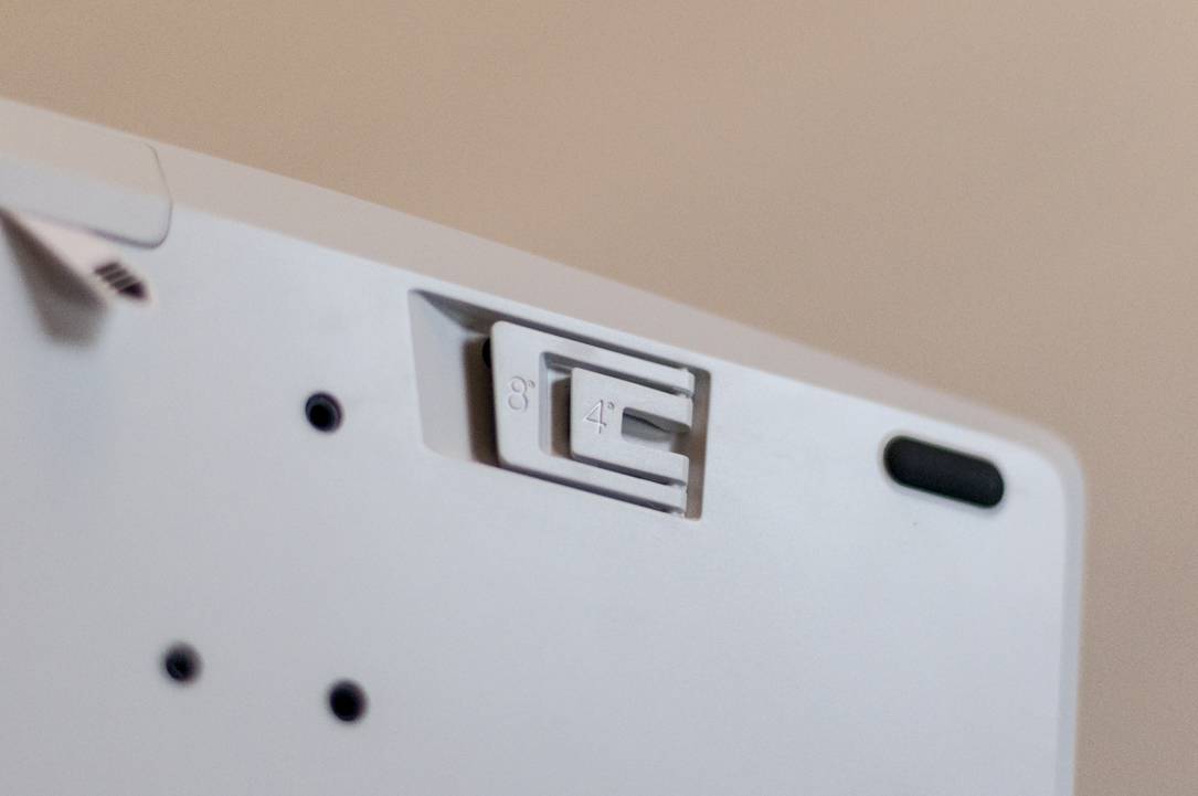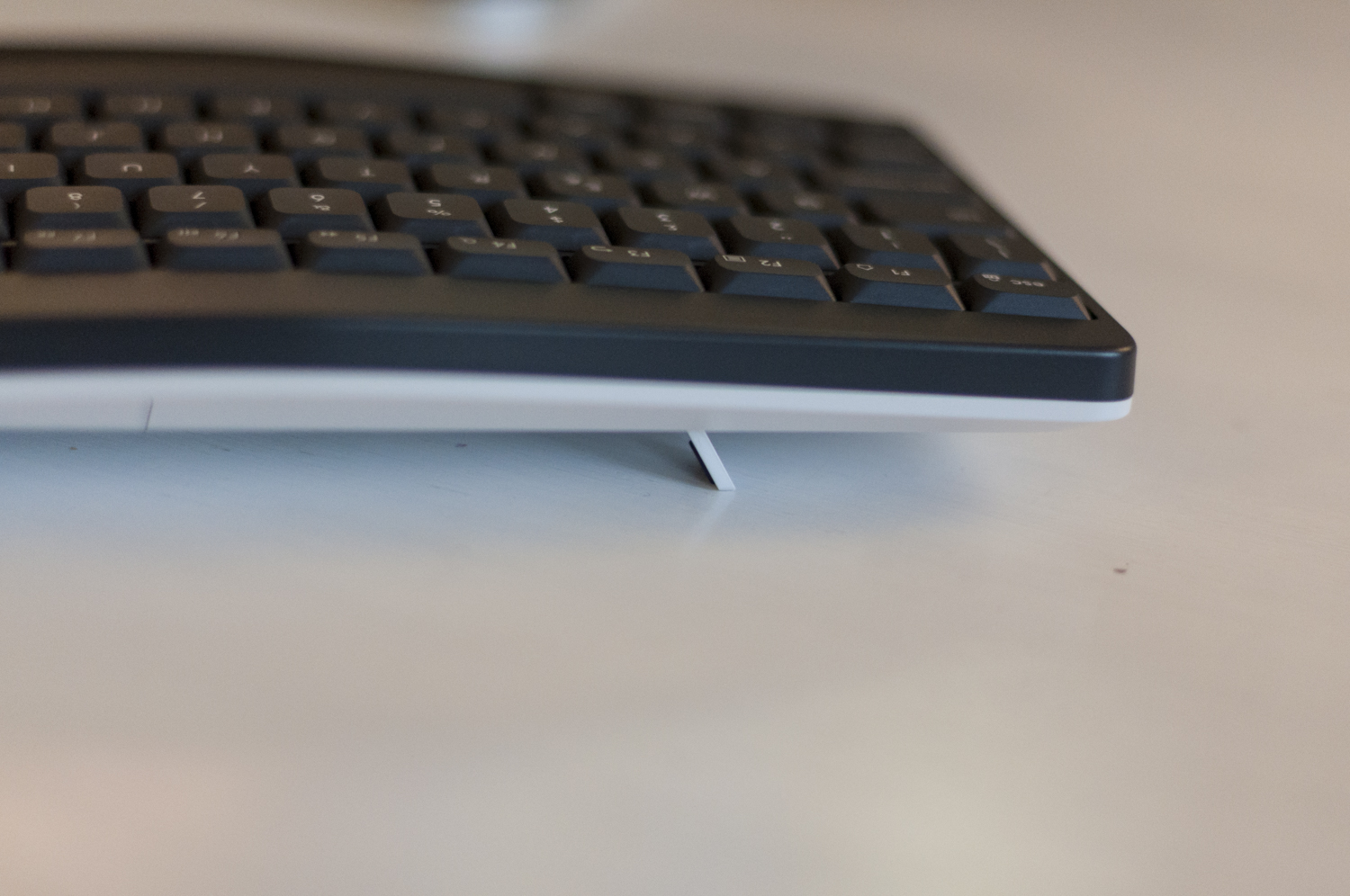 Una volta installata la tastiera, abbiamo notato subito come la forma sia importante sulla scrivania: l’inclinazione si può personalizzare grazie ai quattro piedini diversi sul retro, che consentono tre posizioni (sdraiata, alzata di 13 o di 23 mm), e la comodità di scrittura è garantita anche da un morbido cuscinetto posto alla base, che accompagna il palmo della mano quando non impegnato con i tasti.