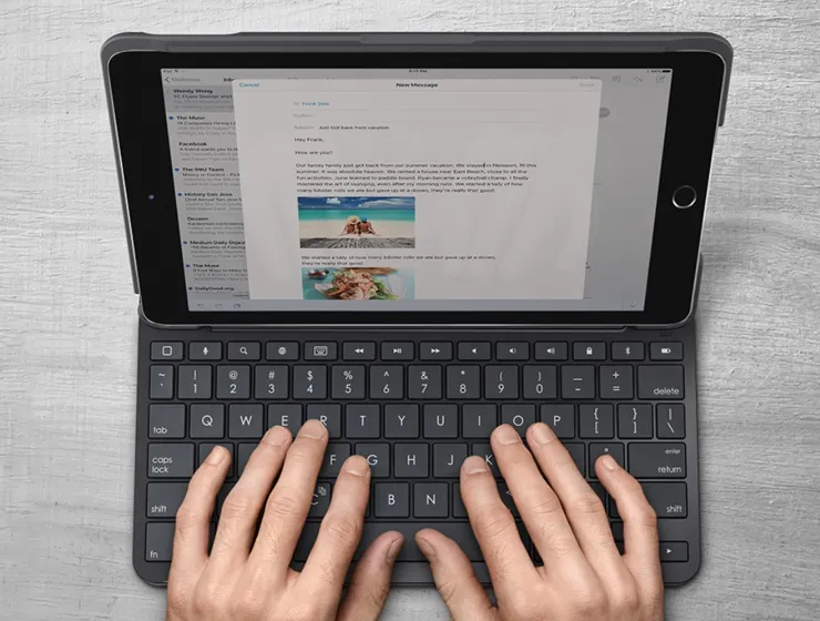 Per usare il nuovo iPad 2017 per scrivere e digitare come su un computer portatile è disponibile la nuova cover con tastiera Logitech Slim Folio. Realizzata con materiale tecnico è sottile, leggera, piacevole al tatto e resistente: protegge completamente il tablet, retro e spigoli inclusi, mentre la tastiera offre una digitazione comoda e veloce grazie ai pulsanti meccanici Scissor-switch ben distanziati tra loro e con una corsa di 1,5mm. Presenti anche tutti i tasti dedicati per la scelta rapida di iOS per regolare il volume, cambiare lingua, controllare la riproduzione della musica, il tasto Home e molti altri ancora.