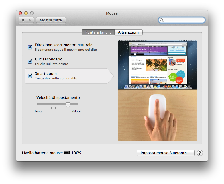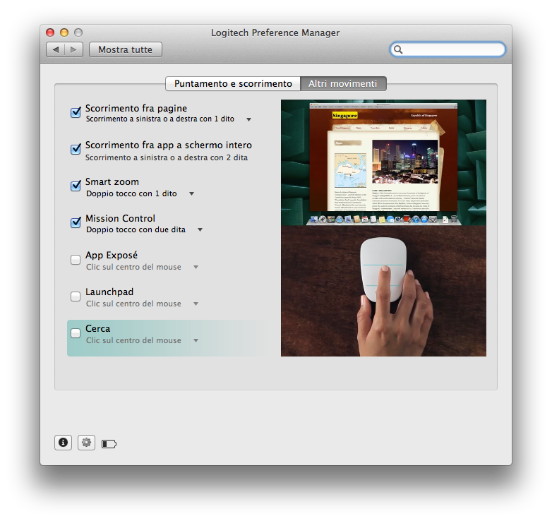 Mentre con il mouse Apple abbiamo a disposizione 5 comandi configurabili, con Logitech Ultrathin Touch Mouse il numero sale a 9. Sfruttando le combinazioni di doppio tocco con un dito, doppio tocco con due dita e la rilevazione del tasto centrale aumentano e, a nostro giudizio, migliorano le possibilità d’uso e di personalizzazione.